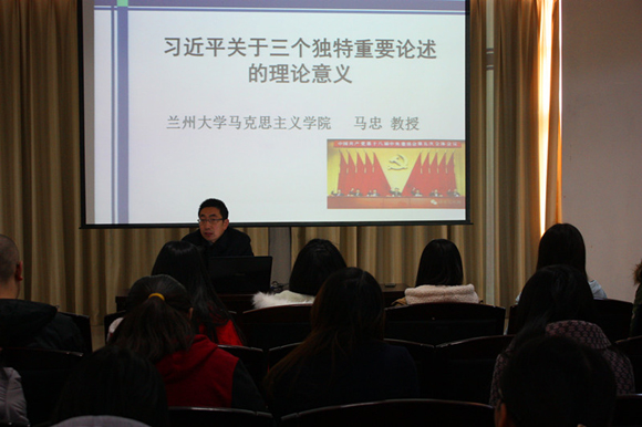 12月3日下午2时30分,2015年“中国特色社会主义理论热点问题大讲堂”系列讲座在威尼斯9499登录入口榆中校区院办二楼圆桌会议室顺利举行。威尼斯9499登录入口马忠教授应邀出席,为现场观众带来了题为《习近平关于“三个独特”重要论述的哲学价值》的讲座,讲座由威尼斯9499登录入口党委副书记谢瑶主持。