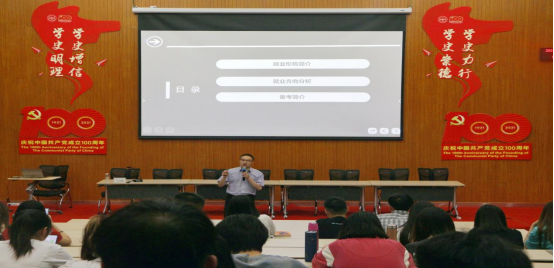 7月10日下午,学院邀请许富栋老师就公考、就业等相关知识向同学们传授经验。他首先就公务员的定位、报考流程和考试内容作出介绍,分析了国考和省考需要的前期准备,并就各省不同的报考要求向同学们进行了简要区别。同时他还简略说明了军队文职、事业单位等职位的优缺点。通过展示甘肃省公务员考试日程安排,许富栋形象地说明了每年公考的丰富多样,以幽默风趣的例子宽慰大家不必过于担忧一次考试的失利。之后许富栋向大家细致地讲解了行测类考试中数量关系类、逻辑类、图形判断类、言语理解类和资料分析类的题目,使各位同学对于公务员考试的独具特色的考察方式有了一定了解。笔试是基础,面试是综合能力考察的重要组成部分,以结构化面试为主的公职类考试和以无领导小组讨论为主的企业面试更是对每位应考者的知识素养和心理素质提出了高标准的要求。许富栋在为大家介绍各类面试的形式和流程的同时也举出大量实例,让同学们对于面试具有深入的了解。他同时提醒各位同学要加强对时政的关注,让学习融入自己生活的点点滴滴,将社会主义核心价值观内化于心、外化于行,统一于实践之中,时刻充实自己,赢在起跑线上。