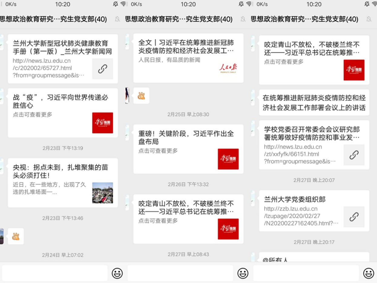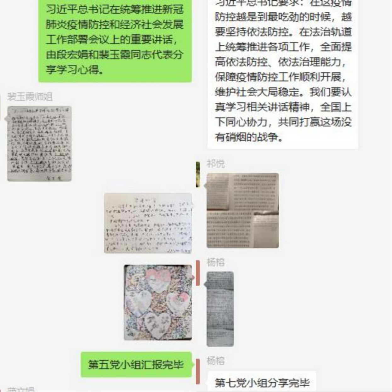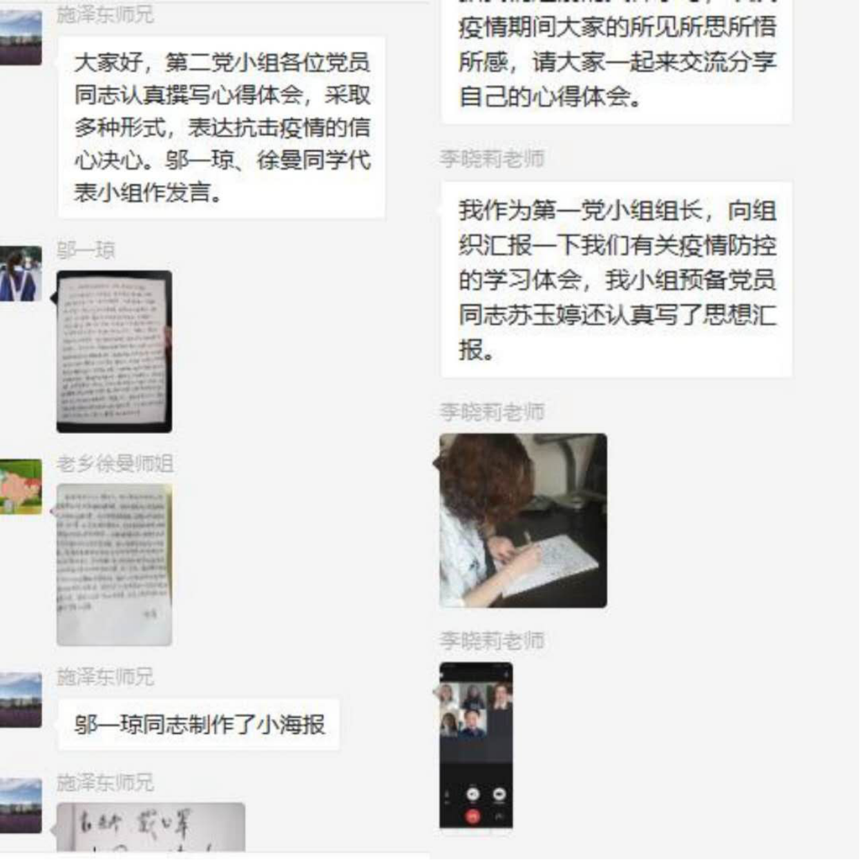 随后,40名党员以党小组为单位,认真学习了习近平总书记有关疫情防控的系列重要讲话,并在微信群以文字和图片的形式发表自己的见解,展开热烈的讨论,预备党员同志们还向党组织做了有关疫情防控时期的专题思想汇报。