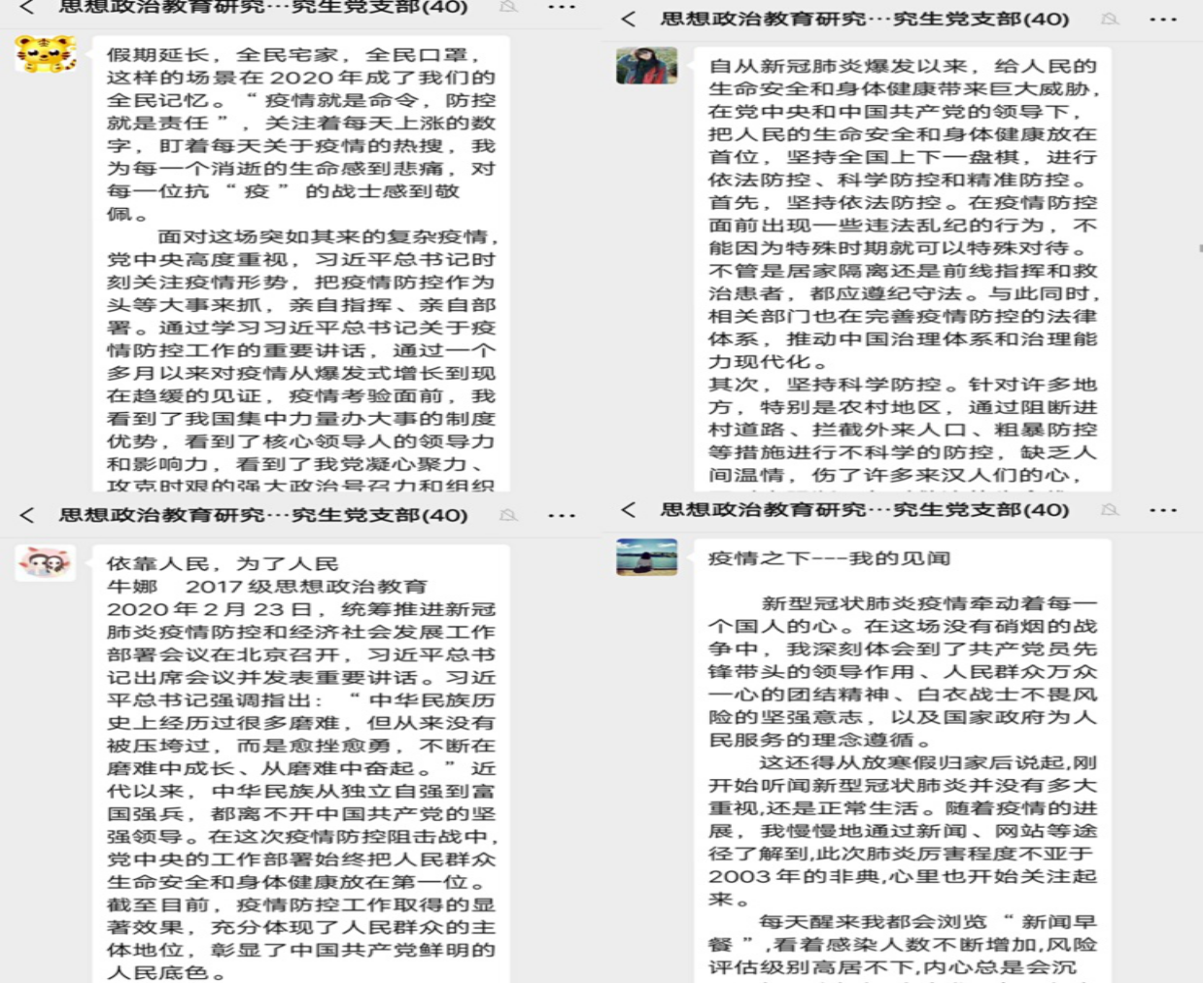 为深入学习习近平总书记关于疫情防控工作的重要指示精神,贯彻教育部关于疫情防控工作的总体部署,切实加强学生党员的思想教育以引导其在疫情防控中强化责任意识,结合特殊时期不宜现场聚集会面等实际情况,威尼斯9499登录入口思想政治教育研究所研究生党支部于2020年3月2日在支部微信群开展了以“坚守信念、咬紧牙关,打好打赢疫情防控阻击战”为主题的线上主题党日活动。支部副书记冯瑞芝同志主持,支部党员全体在线参加。