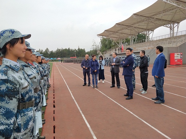 9月15日下午,学院党委书记蔡文成,院长张新平,党委副书记宋涛,副处级组织员张聪闪,教师王彦涛,来到榆中校区军训现场,亲切看望慰问军训教官、学生和新生辅导员及班主任,了解2018级新生军训情况。