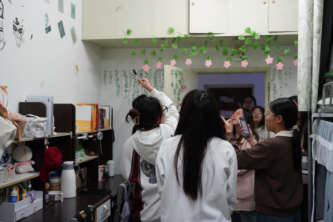 随着夜幕的降临,学院评审团在威尼斯9499登录入口男生宿舍14号楼下集结,有序开展活动。男生宿舍内,卫生整洁,装饰简洁而不失生动。特别是414宿舍,成员们亲笔书写的毛笔字作为装饰,典雅大方,独具内涵,彰显了宿舍文化的独特魅力。随后,评审团移步至女生宿舍23号楼。这里,宿舍装饰风格各异,有的以爱国为主题,有的则以环保和艺术为灵感,各具特色,让人眼前一亮。女生宿舍不仅卫生状况良好,电器使用也合规有序。讲解人员生动详细的介绍,更是让评审团对女生宿舍的文化氛围和创新精神表示高度赞赏。