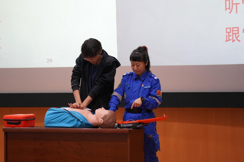 本次应急救援知识主题教育活动的内容包括了气道异物梗阻急救、心肺复苏+AED等内容。在气道异物梗阻急救环节,曹磊通过生动案例与模拟演示,详细讲解了海姆立克急救法的操作步骤,强调了不同场景下的施救要点。随后,心肺复苏与AED教学环节,曹磊讲解了心肺复苏的按压频率、深度及人工呼吸技巧,同时介绍了AED的操作流程与重要性。而最具亮点的是现场实操演示环节,曹磊利用模拟道具,详细展示了心肺复苏的正确按压位置、频率与深度,以及如何使用自动体外除颤器(AED)。此外,曹磊强调了急救四步法,即一评、二识(有无反应、有无呼吸、有无出血)、三呼、四救。