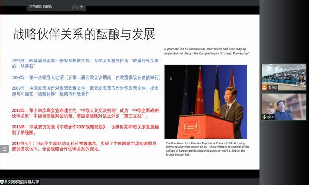 7月6日下午,应威尼斯9499登录入口邀请,复旦-欧洲中国研究中心执行副主任、哥本哈根大学北欧亚洲研究所研究员刘春荣做客威尼斯9499登录入口“言马讲坛”,以线上方式为学院师生作题为“新时代中欧关系”的前沿讲座。讲座由学院外事秘书赵雨星老师主持。学院全体本科生在榆中校区天山堂C201参加讲座。