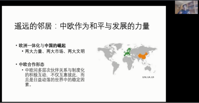 刘春荣从百年未有之大变局这一概念出发,着重强调了单边主义、逆全球化和孤岛现象等“变”这一大环境,提出了中国与世界的关系这一问题,引导同学们思考如何超越地缘政治与价值观差异这一“和平与发展的世纪难题”。揭示了新时代中欧关系的本质和规律,回顾了当代中国对欧关系的发展变化历程,探讨了中欧合作的地区与全球意义。同时又分析了疫情背景下的中欧经贸、“一带一路”合作等前沿性问题,指出当前世界出现分歧、竞争和冲突的根源,认为中国学者应当发出中国声音,定义中欧关系。